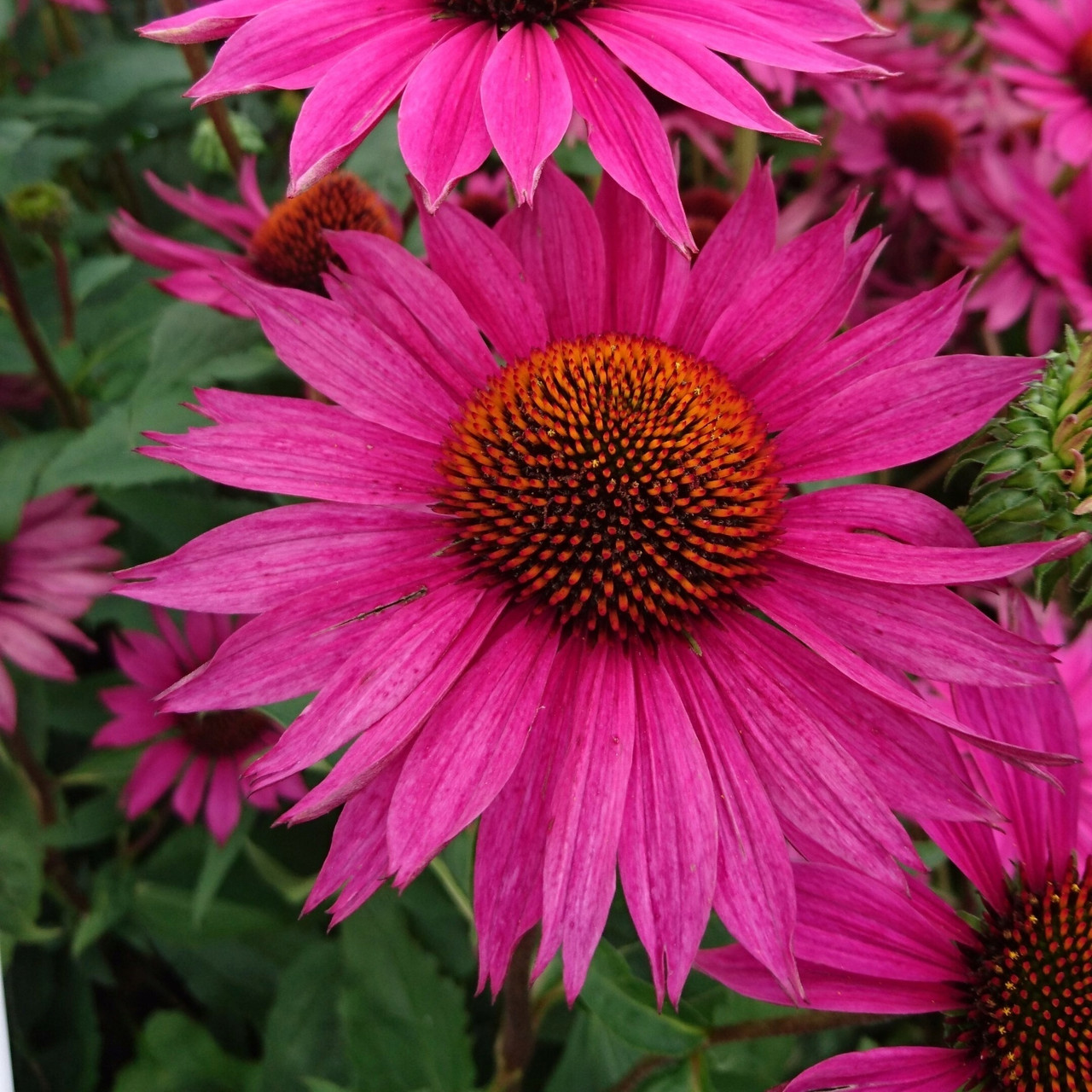 Эхинацея пурпурная Робин Хоод (Echinacea purpurea Js Roho) - имеет ярко-пурпурные или фиолетово-розовые лепестки и плоский, темно-оранжевый центр. Это многолетнее растение, известное своим обильным цветением с июля-августа до осени.